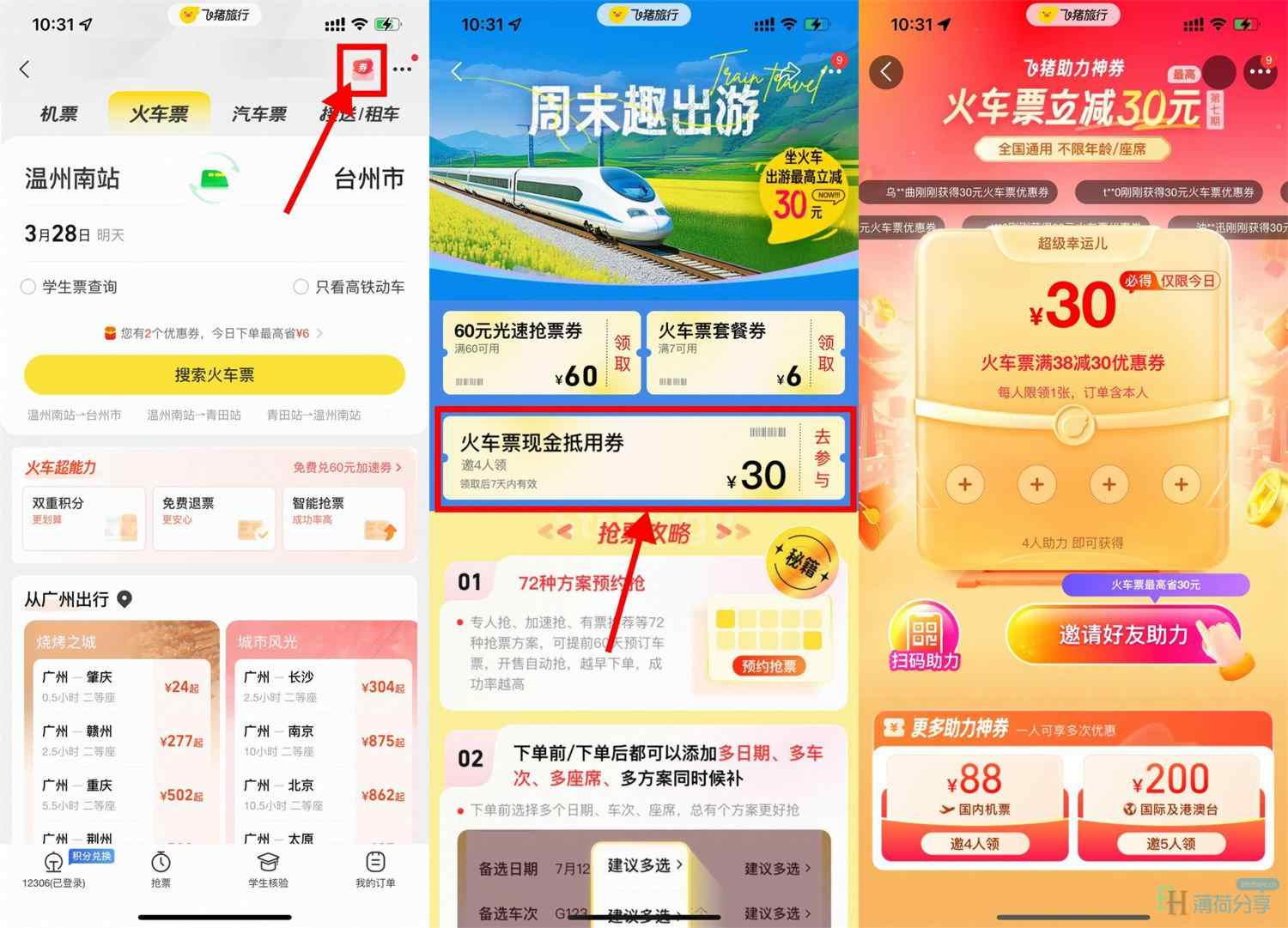 飞猪4人助力领30元火车票券