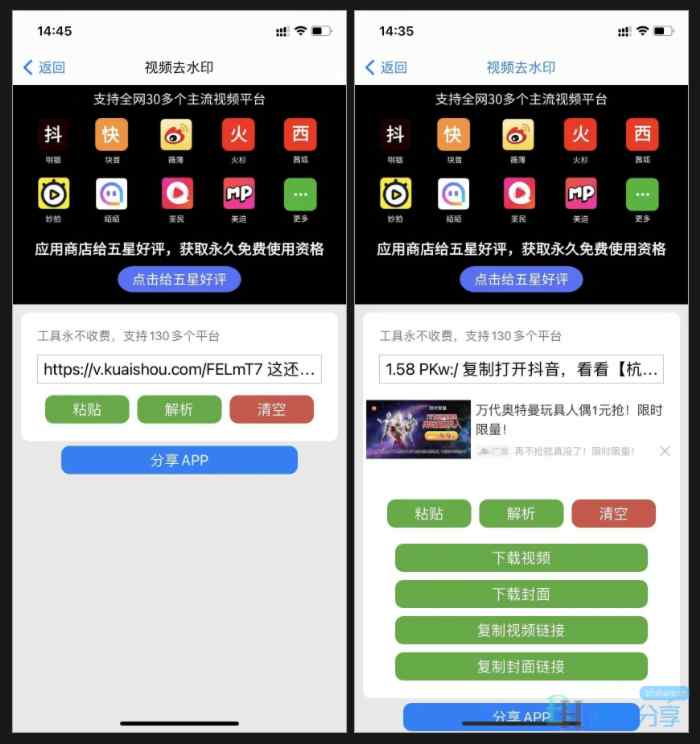 黄柚水印,支持无水印下载视频、封面,兼容130多个短视频平台,还内置视频、图片处理工具合集。解析下载速度快,App Store近1.5万评价接近满分,永不收费,手慢无!